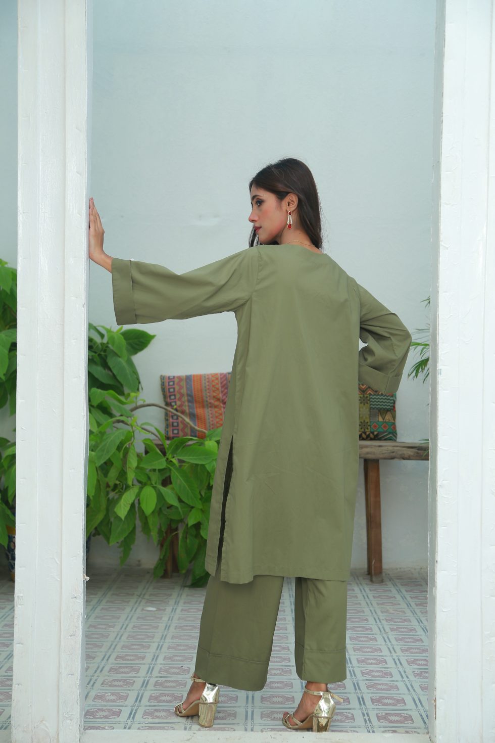 Paired with matching trousers that have pleated detailing and a silver trim.