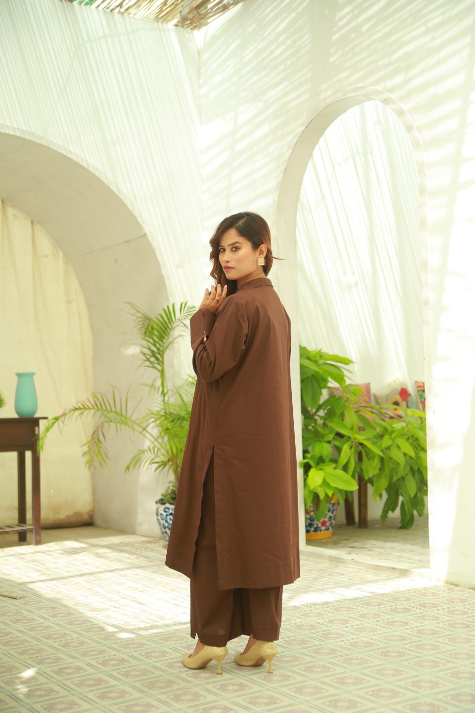 The shirt is long, straight, and simple with minimal detailing near the neckline and sleeves.