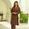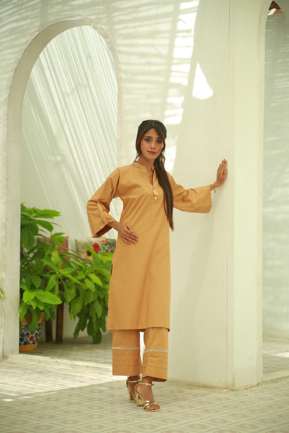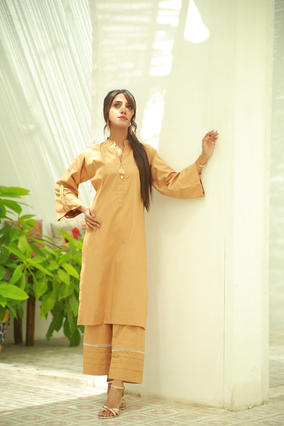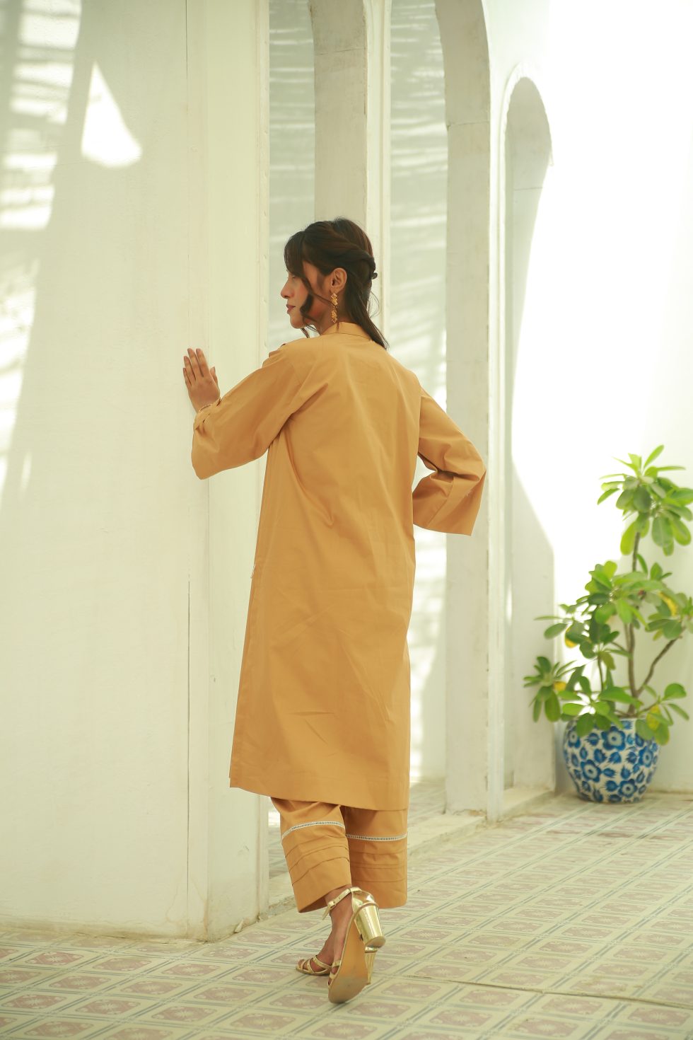 Paired with matching trousers that have pleated detailing and a silver trim.